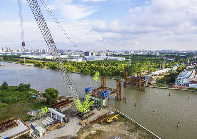 通扬线通吕运河航道是长三角高等级航道网规划和江苏省干线航道网规划的干线航道。通扬线通吕运河航道整治(五级航道提升为三级航道)将改建13座桥梁,正场大桥、通州大桥和二甲大桥均在列。图为通州大桥新建工程施工场景。