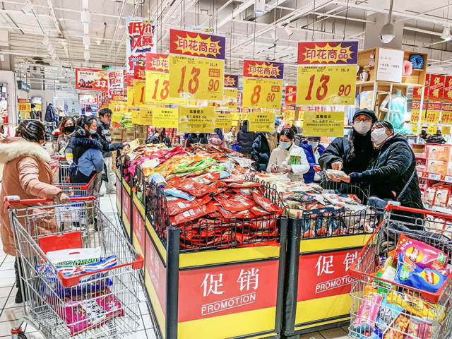 春节前夕是传统销售旺季,城区各大商场、超市纷纷开展年货让利促销活动吸引人气,品种繁多的年货让消费者挑花了眼。图为在城区一大型超市,消费者忙着采购年货。