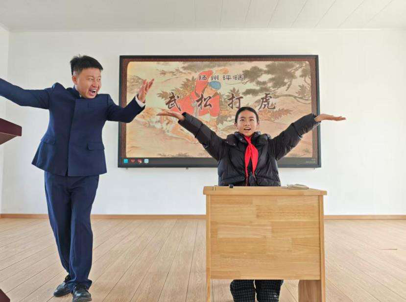 经典选段《武松打虎》将活动推向高潮。李仲勇一人千面,时而化身勇猛机智的武松,时而模仿咆哮狰狞的猛虎,精湛口技与生动肢体语言让人物形象跃然眼前,全场掌声雷动。随后,他邀请学生上台,手把手指导惊堂木使用基础表演动作,互动中满是欢声笑语(见上图,张云帆摄)。