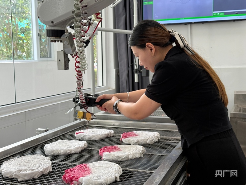 在非遗扎染AI机器人工业流水线上,扎染工人正通过机器臂注染人工示教打样,通过内部系统传至AI机器人注染系统。另一边,扎花工人们紧锣密鼓地进行扎花,成衣进入注染流水线后,机械臂灵活地抓起扎结好的布料,精准悬停在注染工位上方进行注水。两分半钟,10件衣服就完成手绘染色。