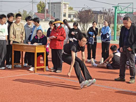 随着比赛正式开始,操场上的欢呼声、呐喊声此起彼伏。在百米赛道上,选手们犹如离弦的箭一般冲出起跑线,衣角在风中呼呼作响;在立定跳跃处,选手们挥臂、屈膝、起跳、落地,一系列动作行云流水(见上图,钱吴蝶 摄);在球类比赛区,选手们更是紧抿嘴唇,全神贯注地盯着球的走向……整个操场上充满了比赛的紧张和欢乐。