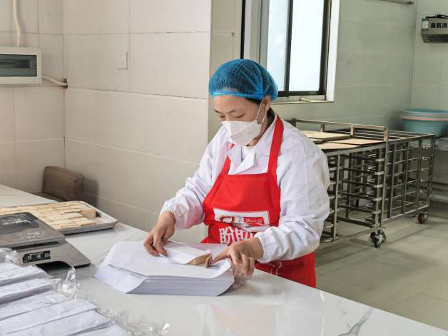从家族小作坊到规模化工厂,改变的是效率,不变的是匠心。在干净整洁的生产车间内,记者见证了薰糕制作的全过程:糖油、糕粉按比例均匀混合后,由切糕机切成厚薄一致的片状,再由工人纯手工一片片摆入烤盘,在高温烘烤六分钟后,进行冷却、包装。“以前和面、切糕全靠人力,从凌晨三点一直做到晚上八点,一天顶多做300条。”刘娟指着这些机械化设备感慨道,“现在有了机器,早上八点开工、晚上六点就能收工,一天能生产600条,不仅口感一点没差,产量还翻了倍。”