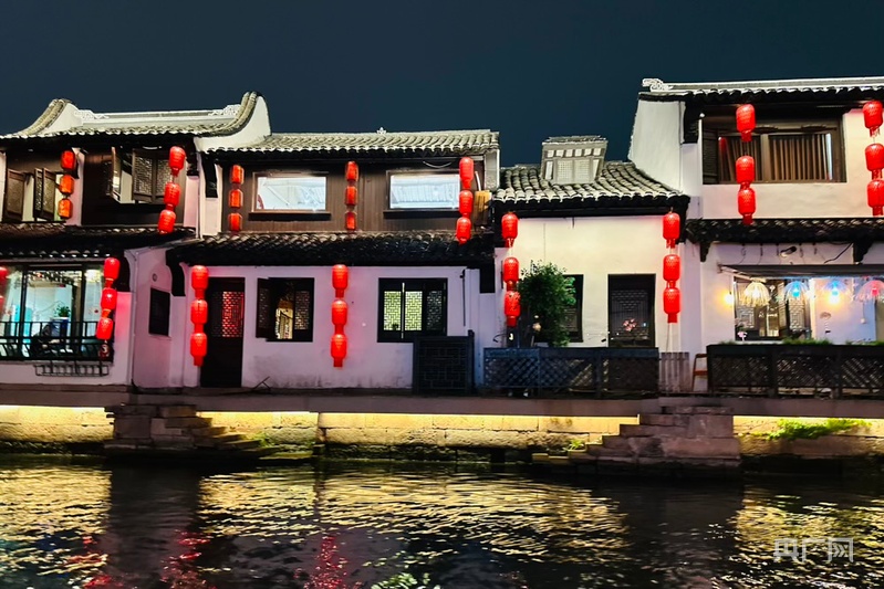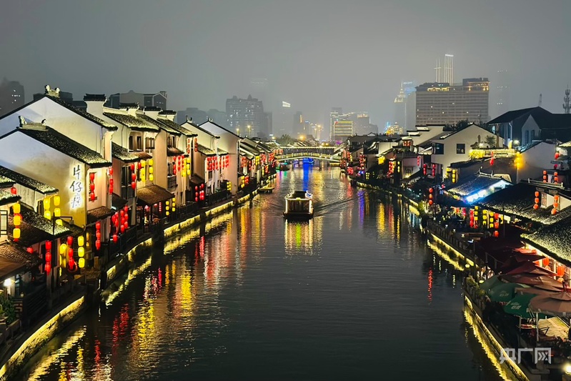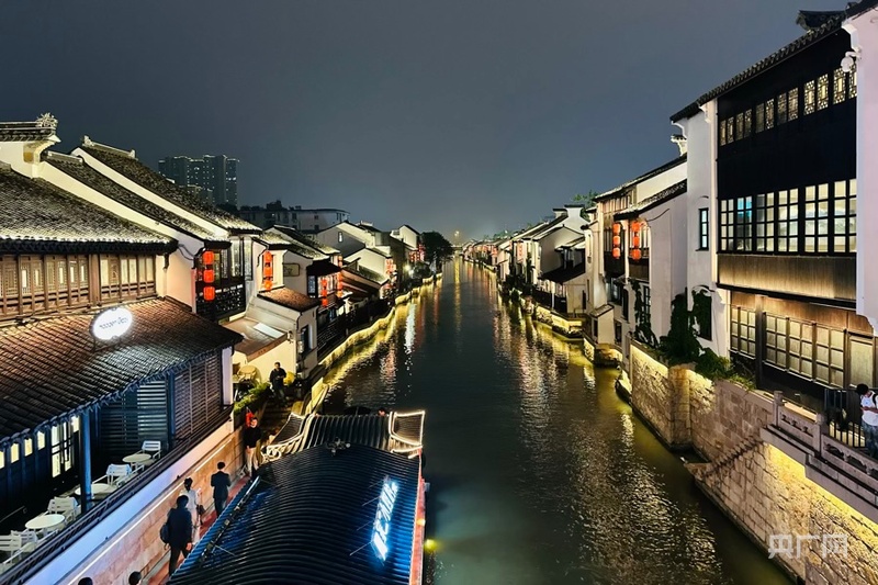 夜幕降临,位于无锡市中心南端的清名桥历史文化街区,宛如一幅流动的画。古运河泛起粼粼波光,倒映着两岸的黛瓦白墙与流动的光影。具有400多年历史的清名桥如一弯月牙横卧水上,桥上站满了看夜景的人。