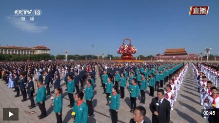 向人民英雄敬献花篮仪式正式开始,全场高唱国歌。