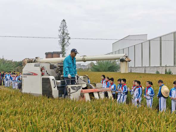 除了割稻、观摩机械收割,孩子们还体验了打稻谷等农耕活动,并参与了一场精彩的农学课堂。这场稻田里的“劳动课”,让孩子们体验了秋收的辛劳,也深刻理解了“谁知盘中餐,粒粒皆辛苦”的含义。“这个活动非常有意义,让孩子零距离接触了从收割到脱粒的全过程,直观感受了现代化农业的高效。我想这就是教育的真实写照,在自然界中去‘呼吸’、去‘伸展’。希望以后有更多的机会,参加这样的活动。”学生家长吴玉梅表示。