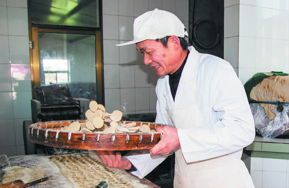 孙建正在擀面,准备做麻饼,一边的筛盘里,是一堆刚烤好的麻饼。“只有面粉、油、水、糖,没别的添加剂,所以味道不浓。”孙建笑着解释。最简单的料也最考验手艺,孙建不怕,他可是有着30多年经验的老手了。