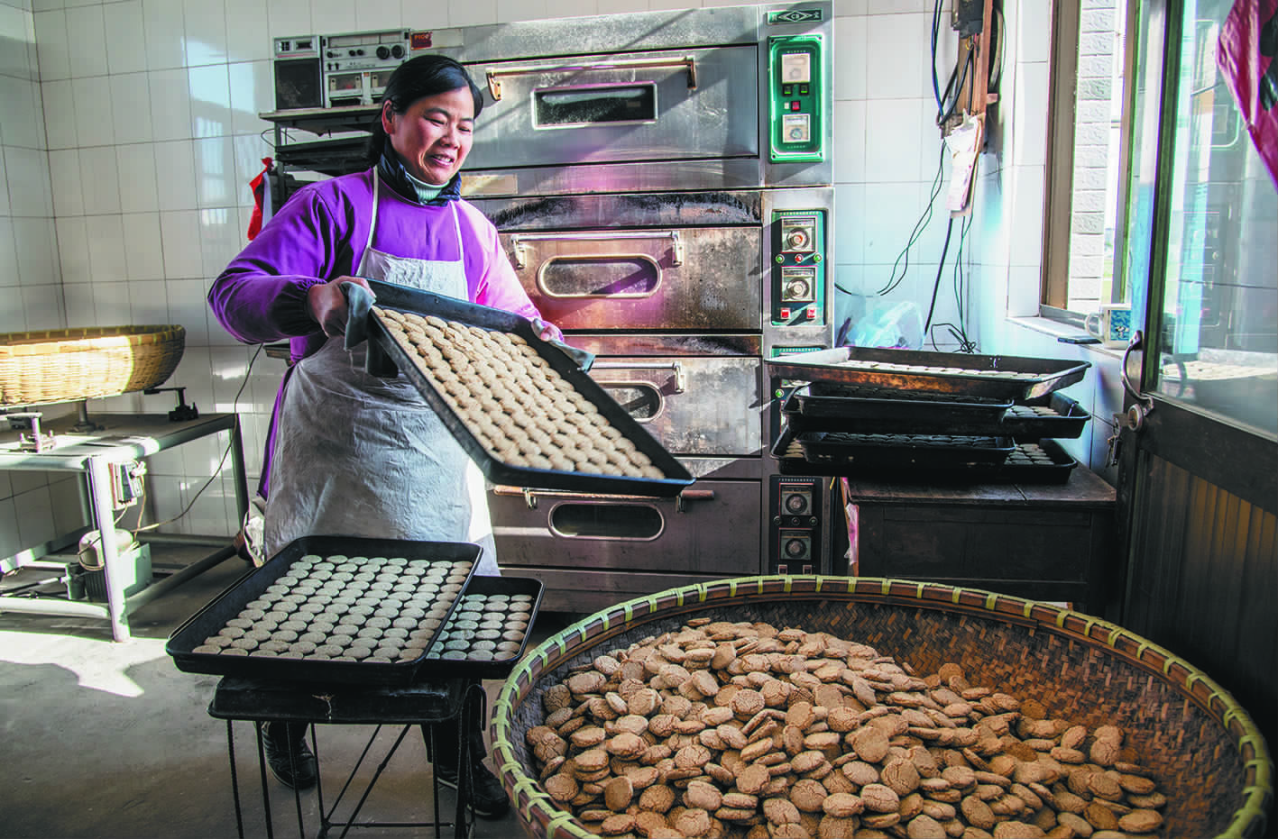 西亭镇李庄村村民孙建夫妇正在加工麻饼。卑多敏 郁洪 摄