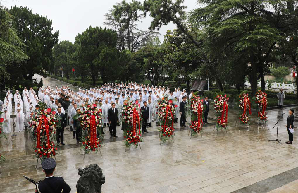 上午9时30分,向革命先烈敬献花篮仪式正式开始。伴随着雄浑高亢的《义勇军进行曲》旋律,全场齐声高唱中华人民共和国国歌。国歌唱毕,全场肃立,向为中国人民解放事业和社会主义建设事业英勇献身的烈士默哀。默哀毕,少年儿童面向纪念碑高唱《我们是共产主义接班人》,表达继承革命传统、当好接班人的远大志向。伴随着深情的《献花曲》,18名礼兵托起由党政军群各界代表敬献的9个花篮,正步走向烈士纪念碑,将花篮摆放在纪念碑基座前。张建华缓步上前,轻轻整理花篮上的缎带。随后,全体人员依次登上纪念碑基座,瞻仰烈士纪念碑。