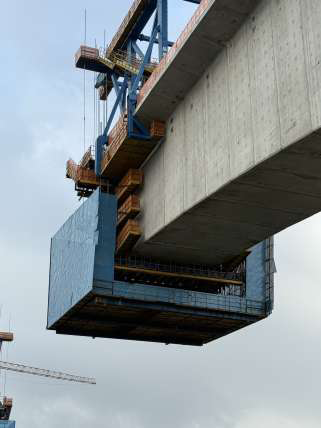 目前,项目中跨混凝土梁段已进入钢混混合段施工关键期。为确保年底全线钢梁合龙,建设团队采用“钢梁拼装+混凝土浇筑”双班组协同作业模式:钢梁班组完成地面拼装与校验后,吊装团队精准定位,混凝土班组即刻开展钢筋绑扎与浇筑。马磊透露:“预计10月份完成钢混段施工,今年底实现钢梁合龙,全力保障年度节点目标。”